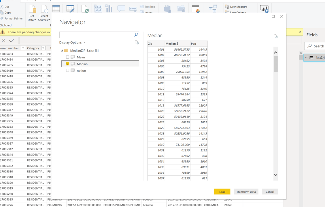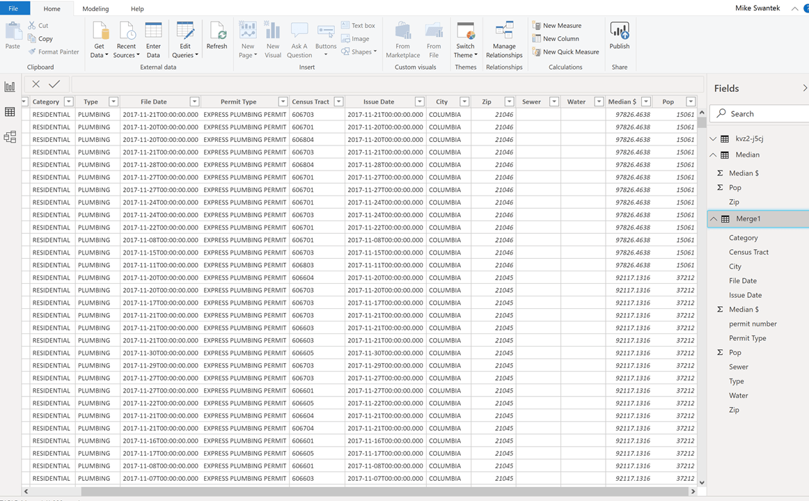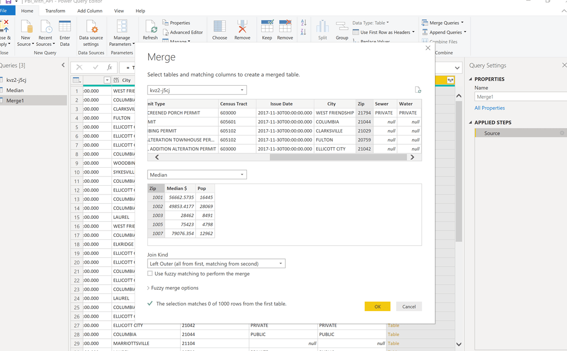 This step is what will connect the key fields in both the table and the API that you have brought in. After this step, you will produce a new table that has joined all the information from the query (Building permits by zip code) to the Median Household income by zip code table.