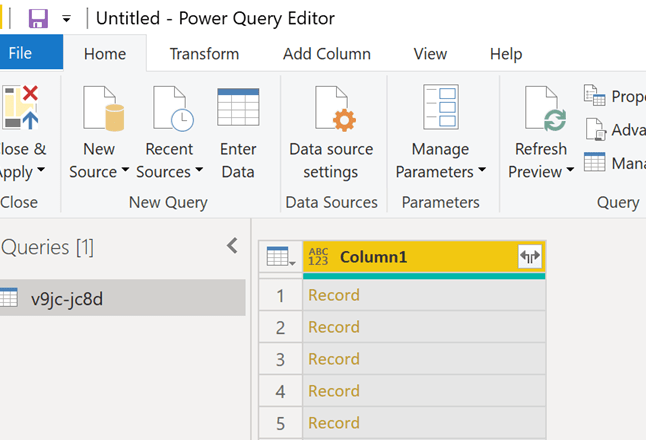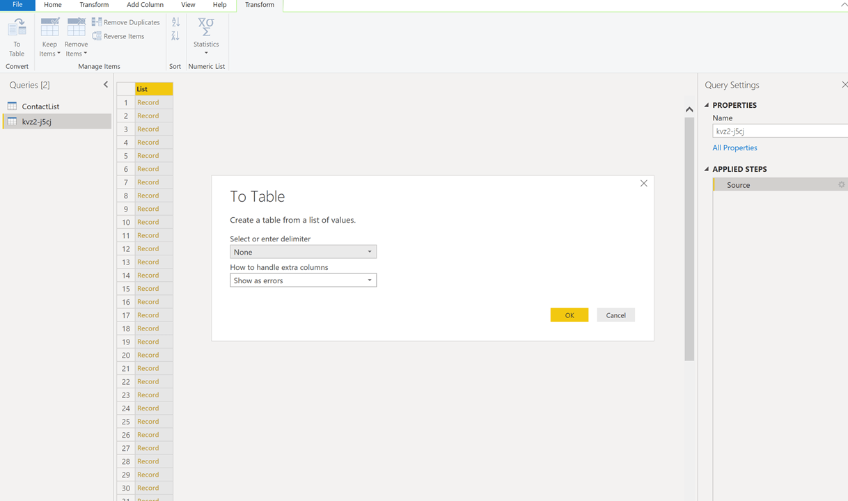 This step adds the csv data to the Power Query editor as a table.